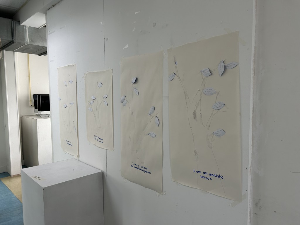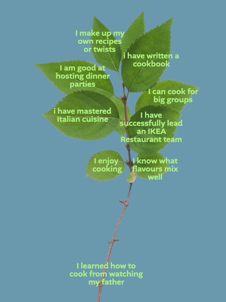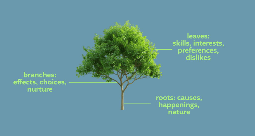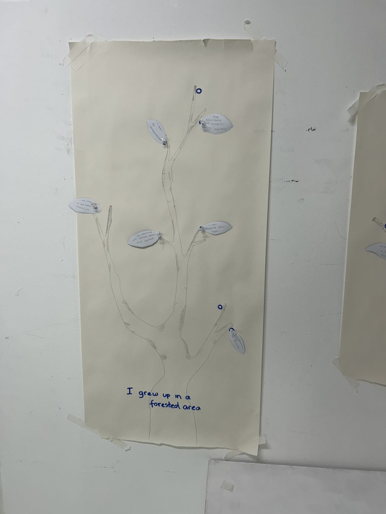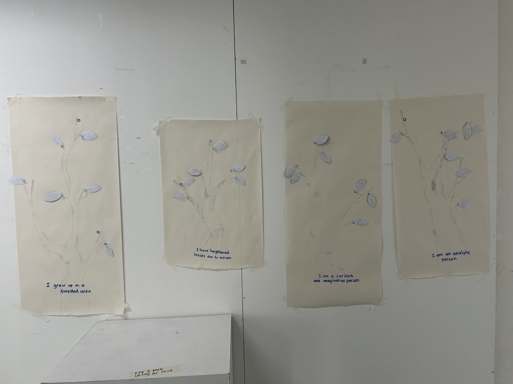 I gave my classmates an introduction to my concept, and then asked them to take “leaves” (aka skills/likes/interests/dislikes) and add them to the right branch (which evolved from a root) — the associations i made were as follows: