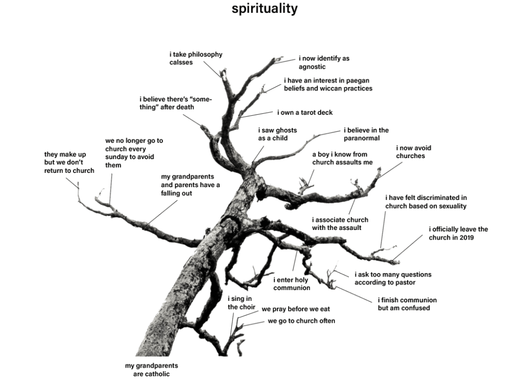 for my presentation of Frame of Reference 4 – I presented myself through a mapping method using tree branches and other segments of trees, such as roots and leaves.