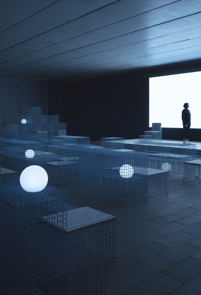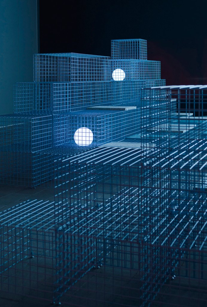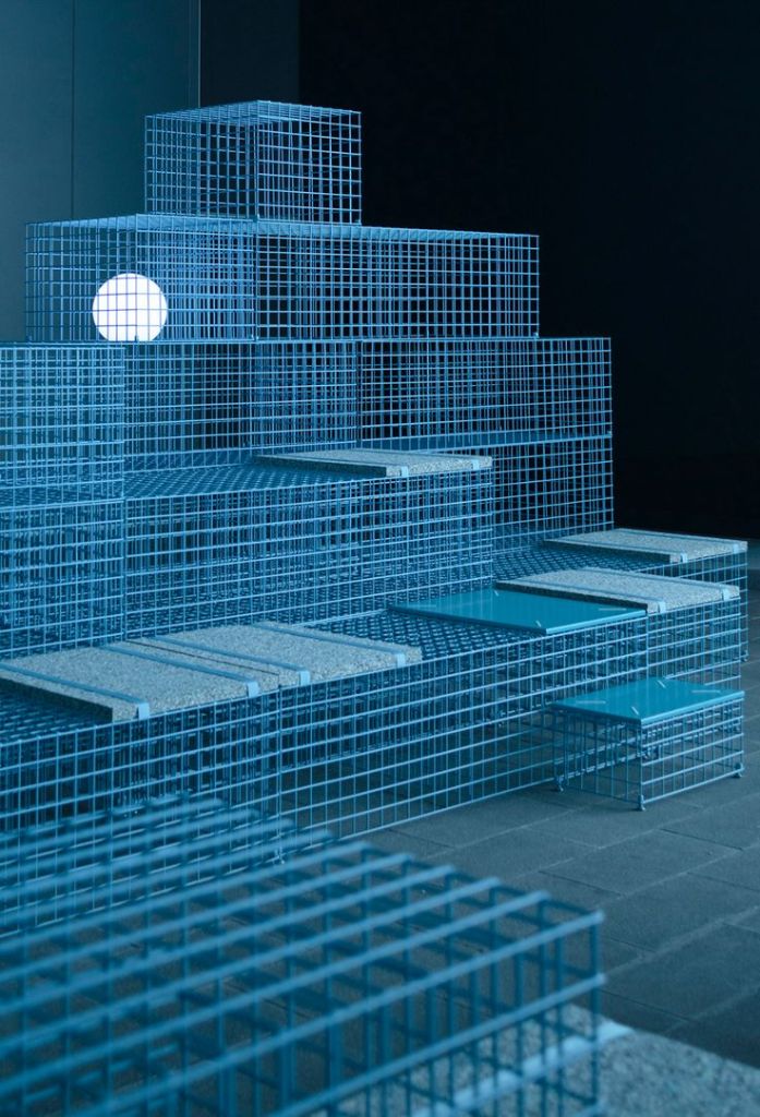 The Sea, arises from the context in which the installation is located, in «La Marina de Valencia», on the shores of the Mediterranean Sea. Inspired by the waves of the sea, Clap Studio created a conceptual sea made from electro-welded wire mesh modules that are superimposed on each other, generating different opacities and different depths in the sea. The studio also thought about the ambient lighting of the space using integrated spherical lights that simulate jellyfish suspended in the water of this sea.