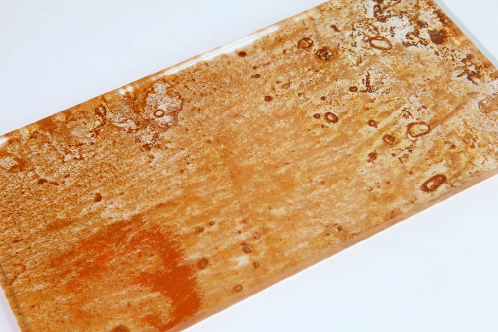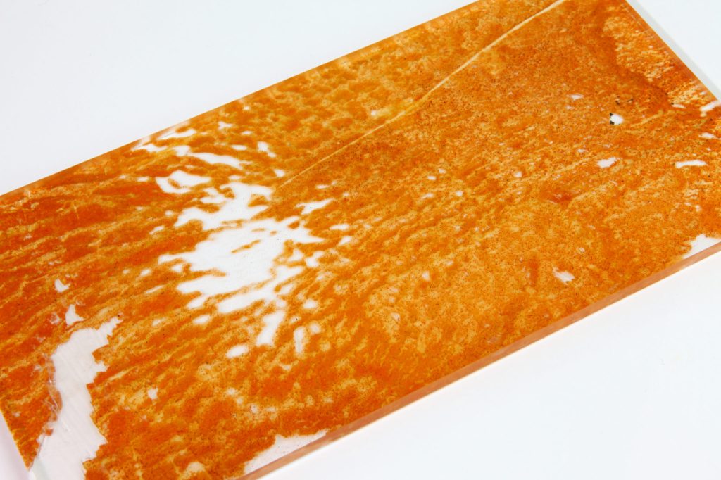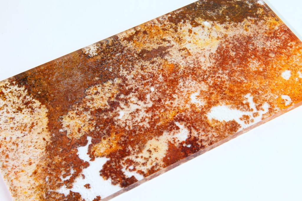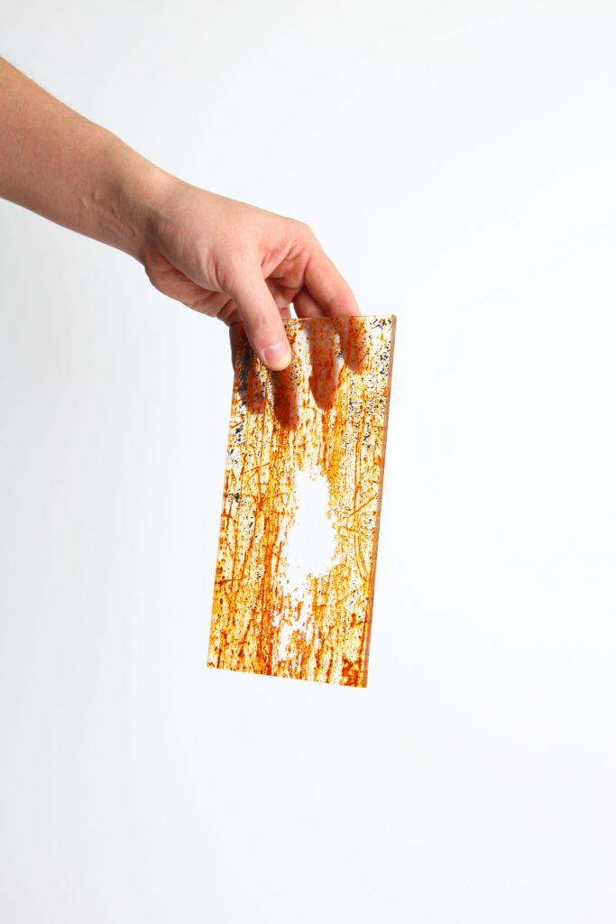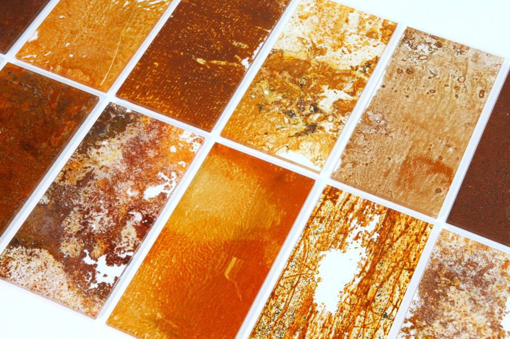 With that in mind, we felt that we could collect some exquisite textures by finding items that have been left to rust through years of exposure to the elements. While experimenting with collection methods, we discovered that applying acrylic resin to a rusted surface and peeling it off would transfer the rust to the acrylic resin, and this technique was used to gather rust from a number of environments. In contrast to its appearance on metallic surfaces, rust that has been captured by resin is translucent, giving it a new beauty in a moment frozen during a process that has taken long years.